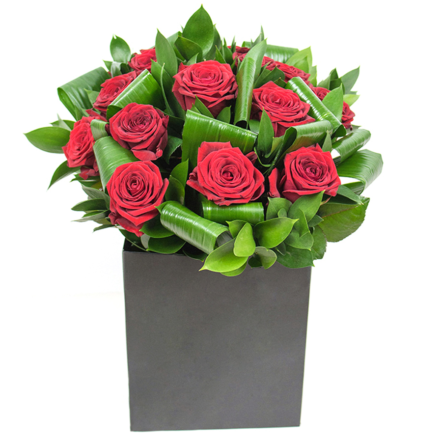 Embrace the charm of our red roses bouquet, thoughtfully combined with aspidistra leaves and ruscus. This unique floral arrangement adds a touch of elegance to any home or event.